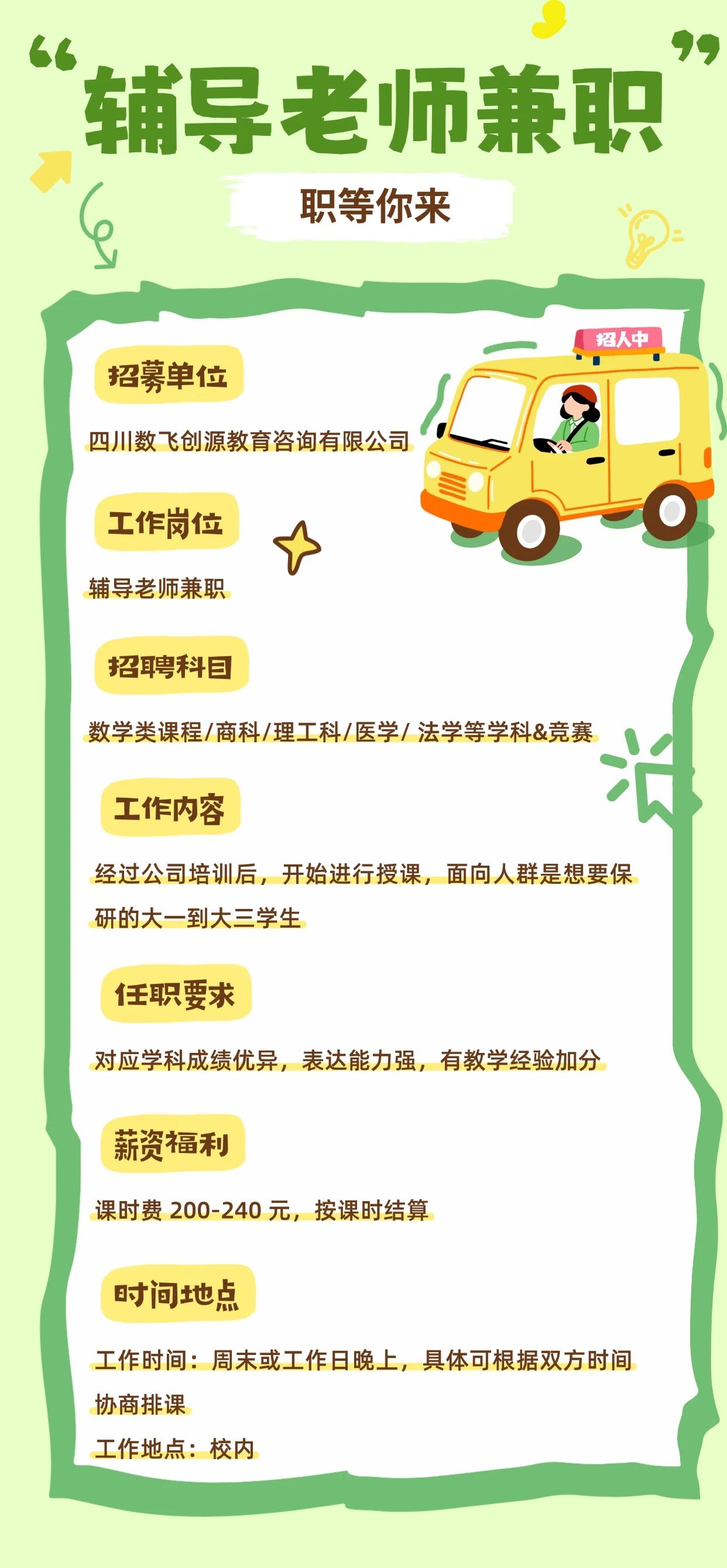 | 课时费200-240元,在自己学校内办公!招募保研辅导老师兼职,周末或者平时晚上有空即可~ |